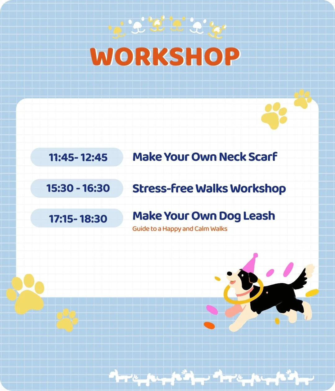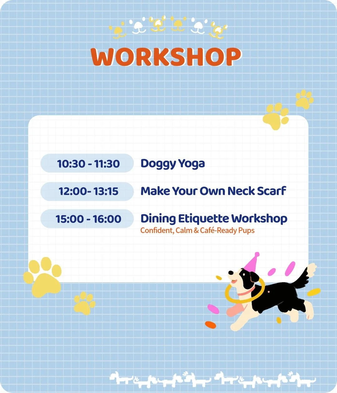 Workshops include doggy yoga, DIY doggy scarves, DIY dog leash, two different basic doggy training, and even making very cute, super healthy doggy macarons!